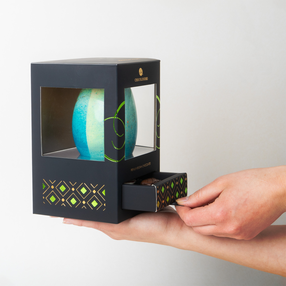 The set includes four handcrafted pralines, created from the finest Belgian chocolate by top European chocolatiers. Each one hides a smooth, velvety filling that melts in your mouth, delivering an exceptional taste experience. The white chocolate Easter egg is packaged in an elegant black premium box with decorative details and a drawer, making the gift ready to present.